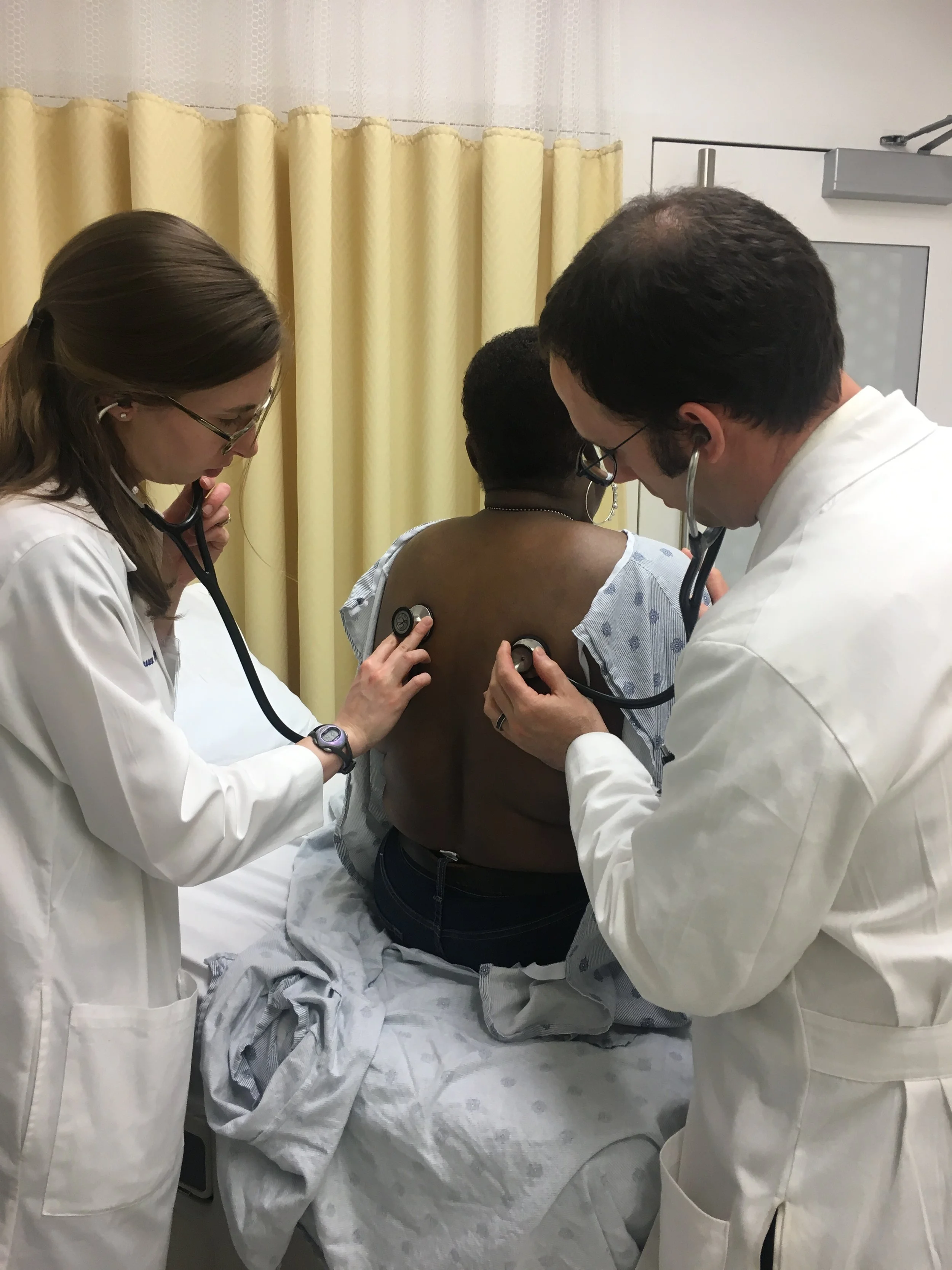 Professor Canfield conducting a bedside cardiac exam teaching session during APECS.